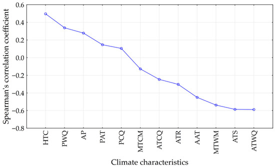 Spearman’s correlation coefficients between forest cover of postagrogenic lands and climatic factors. HTC—hydrothermal coefficient, PWQ—precipitation of the warmest quarter, AP—annual precipitation, PAT—precipitation of the period with temperatures above 10 °C, PCQ—precipitation of the coldest quarter, MTCM—minimum temperature of the coldest month, ATCQ—average temperature of the coldest quarter, ATR—annual temperature range, AAT—annual average temperature, MTWM—maximum temperature of the warmest month, ATS—accumulated temperature over the period with values above 10 °C, ATWQ—average temperature of the warmest quarter.