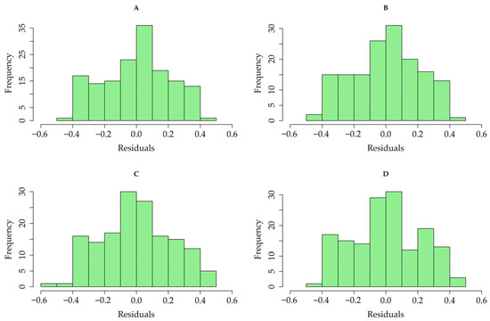 Histograms of residuals for models 1–4 (A–D). Explanations for model numbers are given in Table 3.