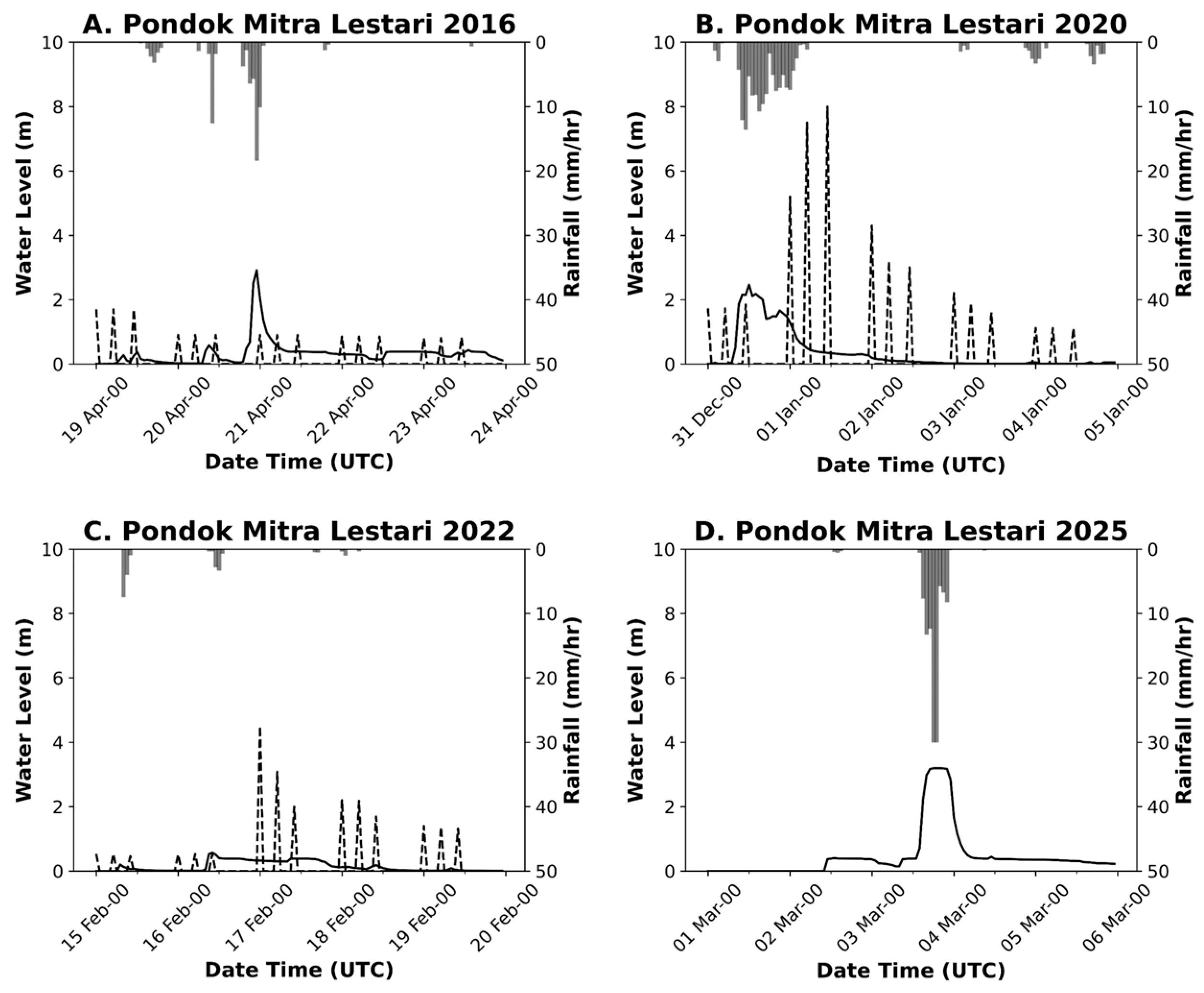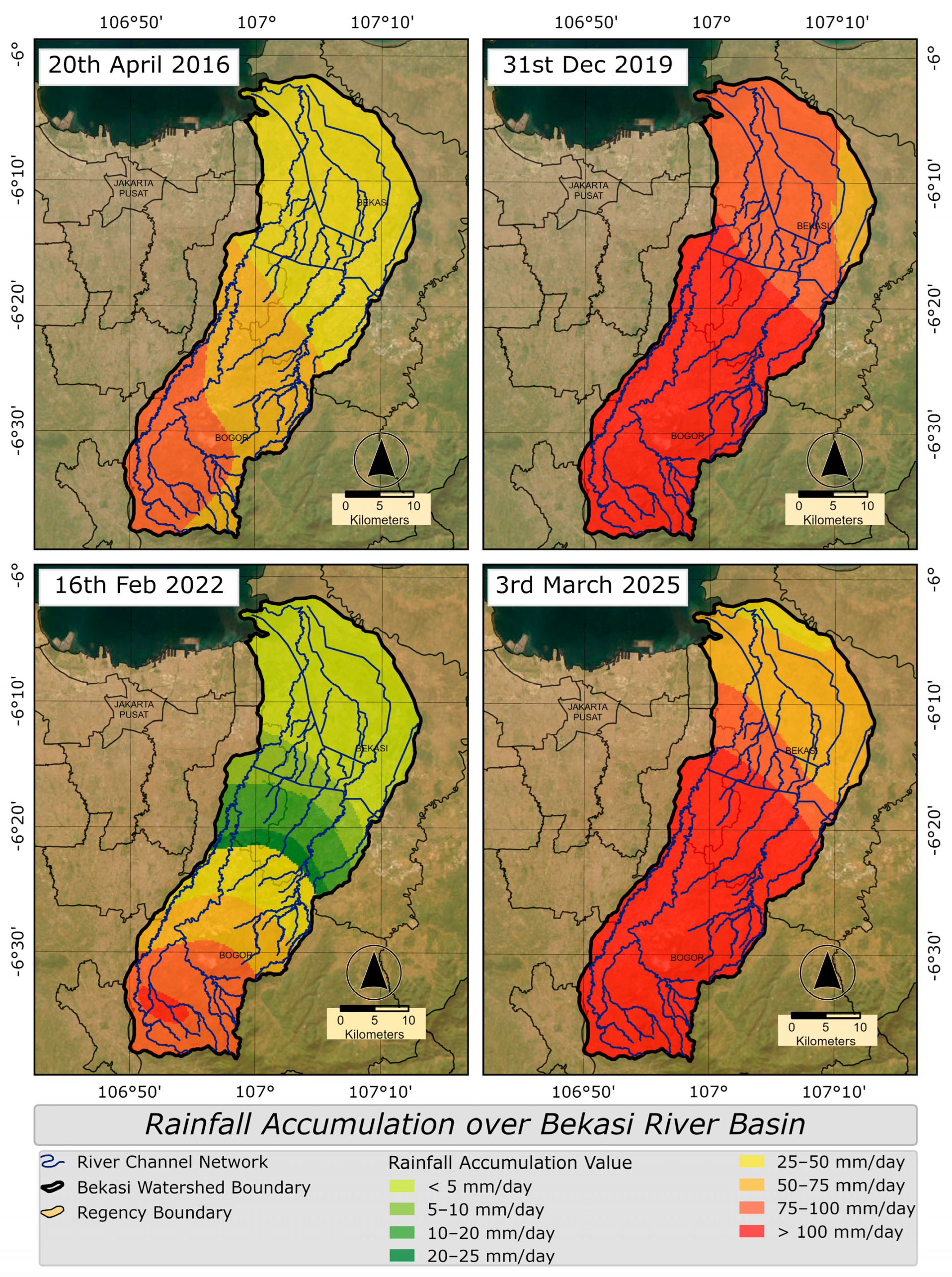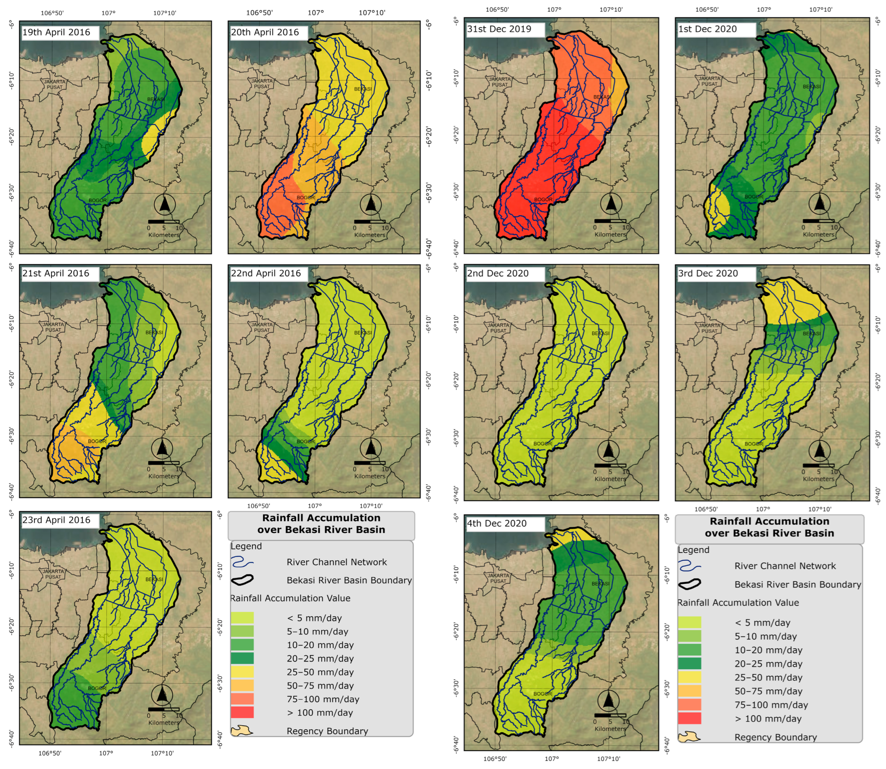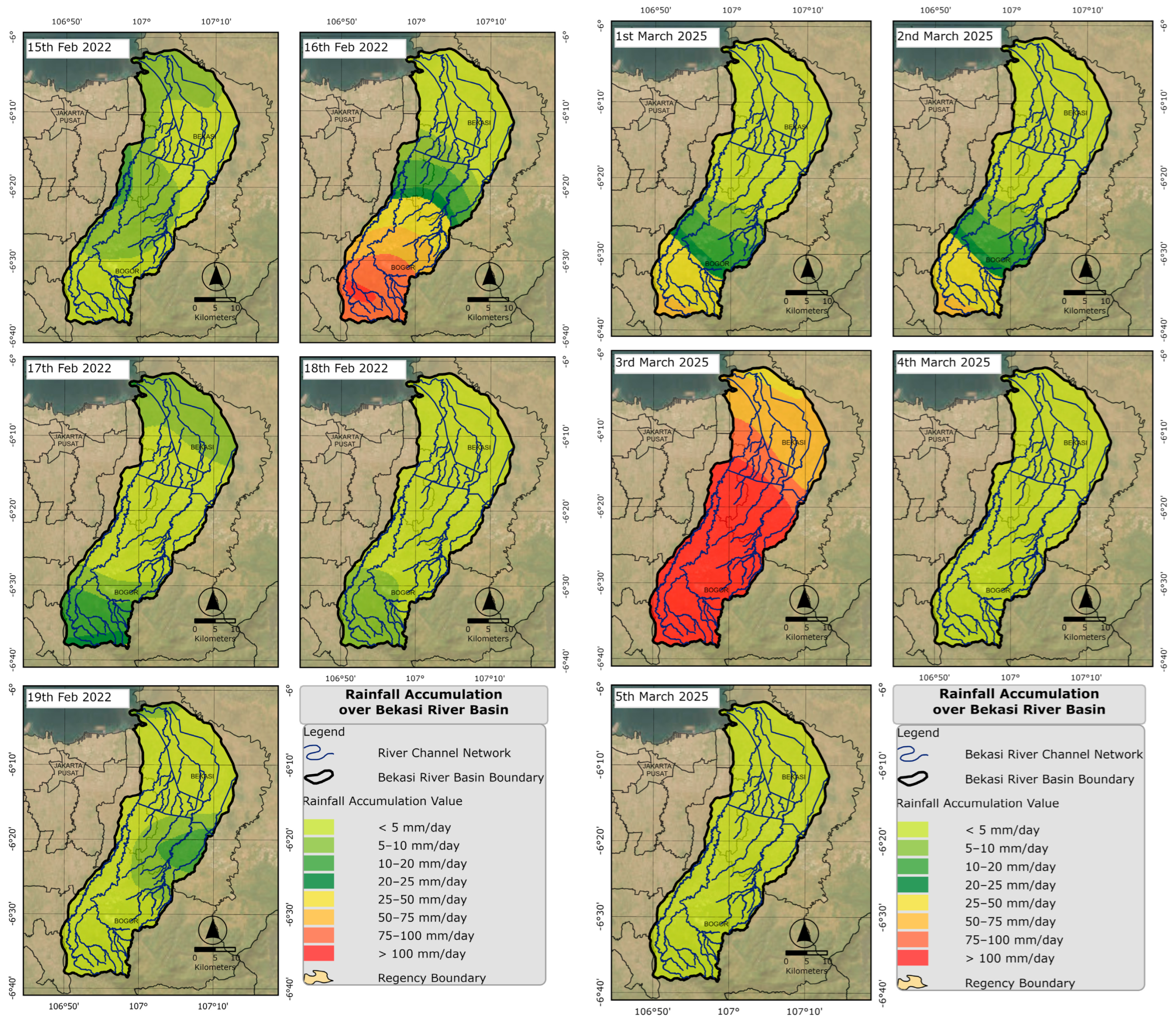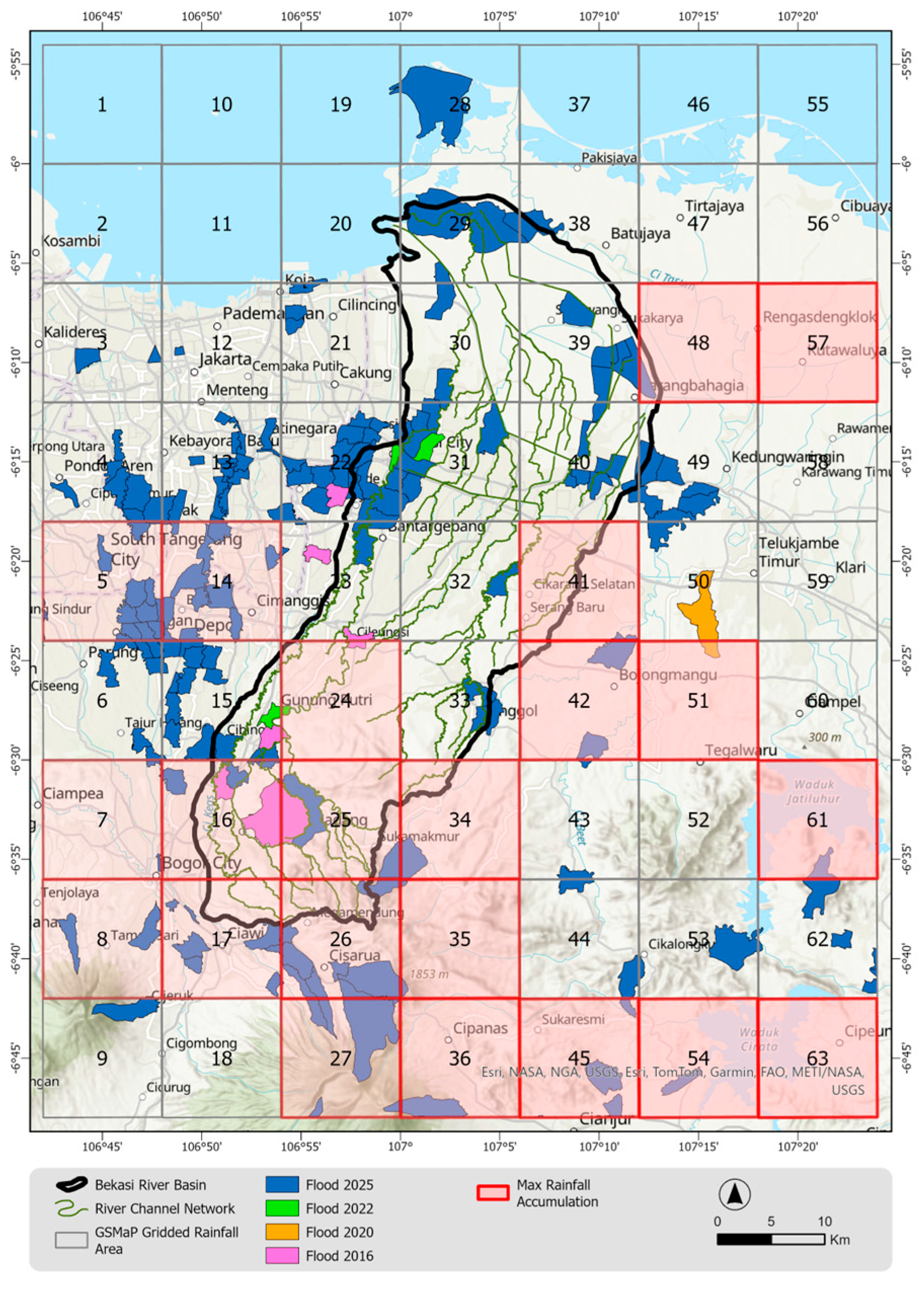 | 2025 | Rawalumbu, Pondok Gede, West Bekasi, Bantar Gebang, North Bekasi, South Bekasi, Jatiasih, East Bekasi, Bogor City, Bogor Regency, Depok City and Jakarta | https://pusatkrisis.kemkes.go.id/situation-report-banjir-kota-bekasi-tanggal-05-maret-2025 (accessed on 15 April 2025) https://bekasikota.go.id/detail/rakor-evaluasi-banjir-kota-bekasi-bahas-pemulihan-pasca-banjir (accessed on 15 April 2025) BPBD Bogor Regency, Bekasi Regency, Bekasi City, Depok City, Jakarta |