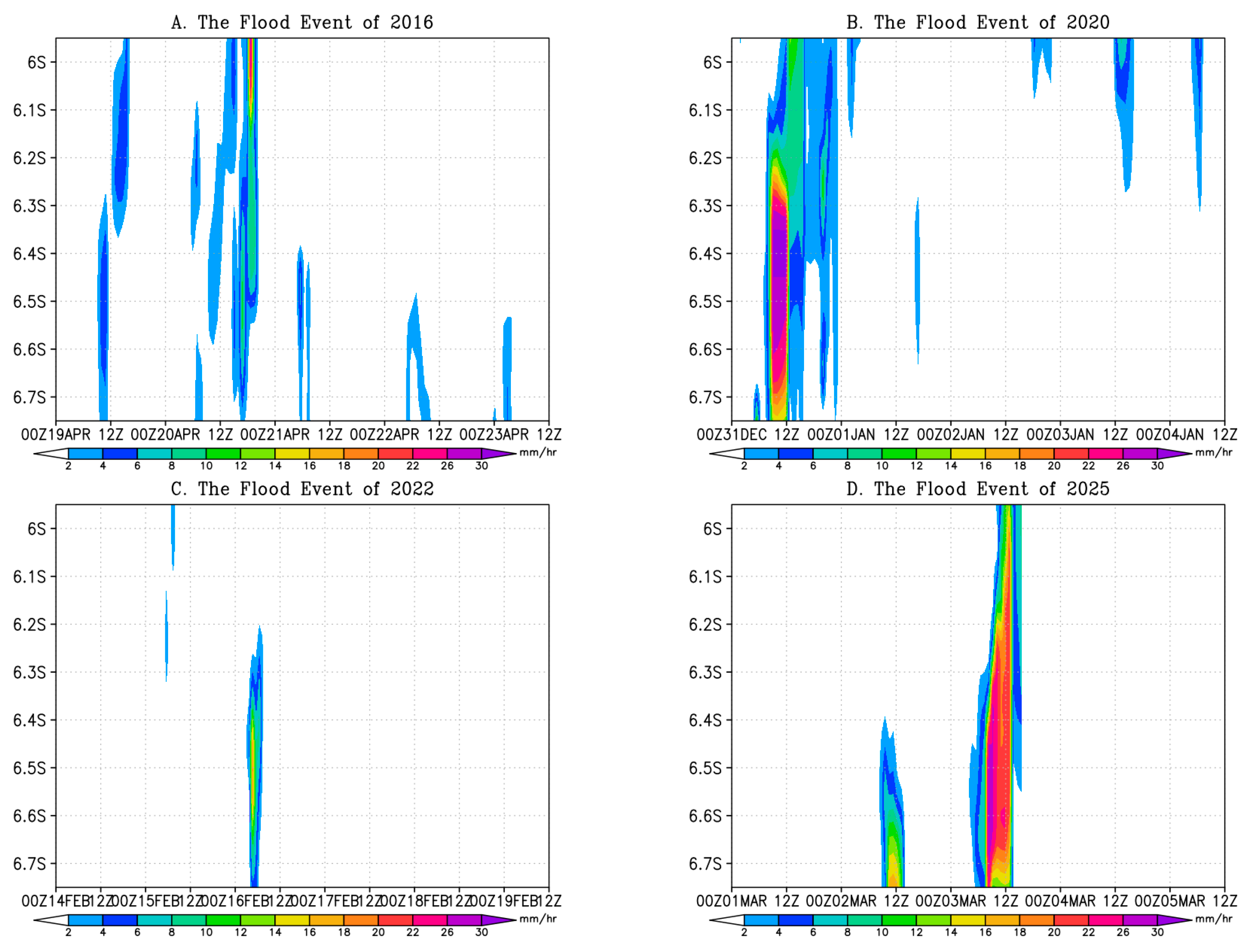 | Rainfall | GSMaP (0.1°~10 km) | Japan Aerospace Exploration Agency (JAXA) Global Rainfall Watch (https://sharaku.eorc.jaxa.jp/GSMaP/) (accessed on 24 January 2025) | 19–23 April 2016 31 December 2019–4 January 2020 15–19 February 2022 1–5 March 2025 |