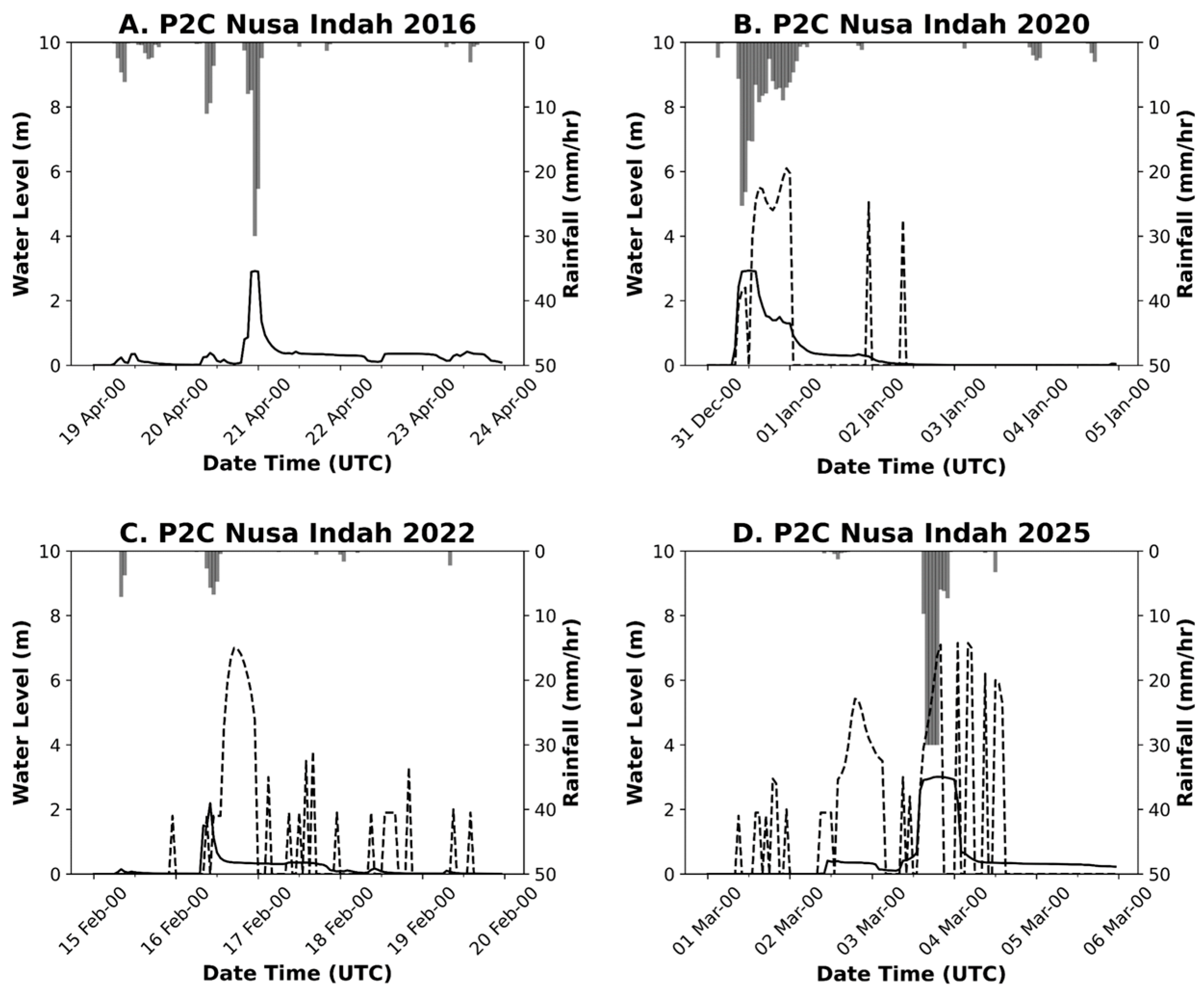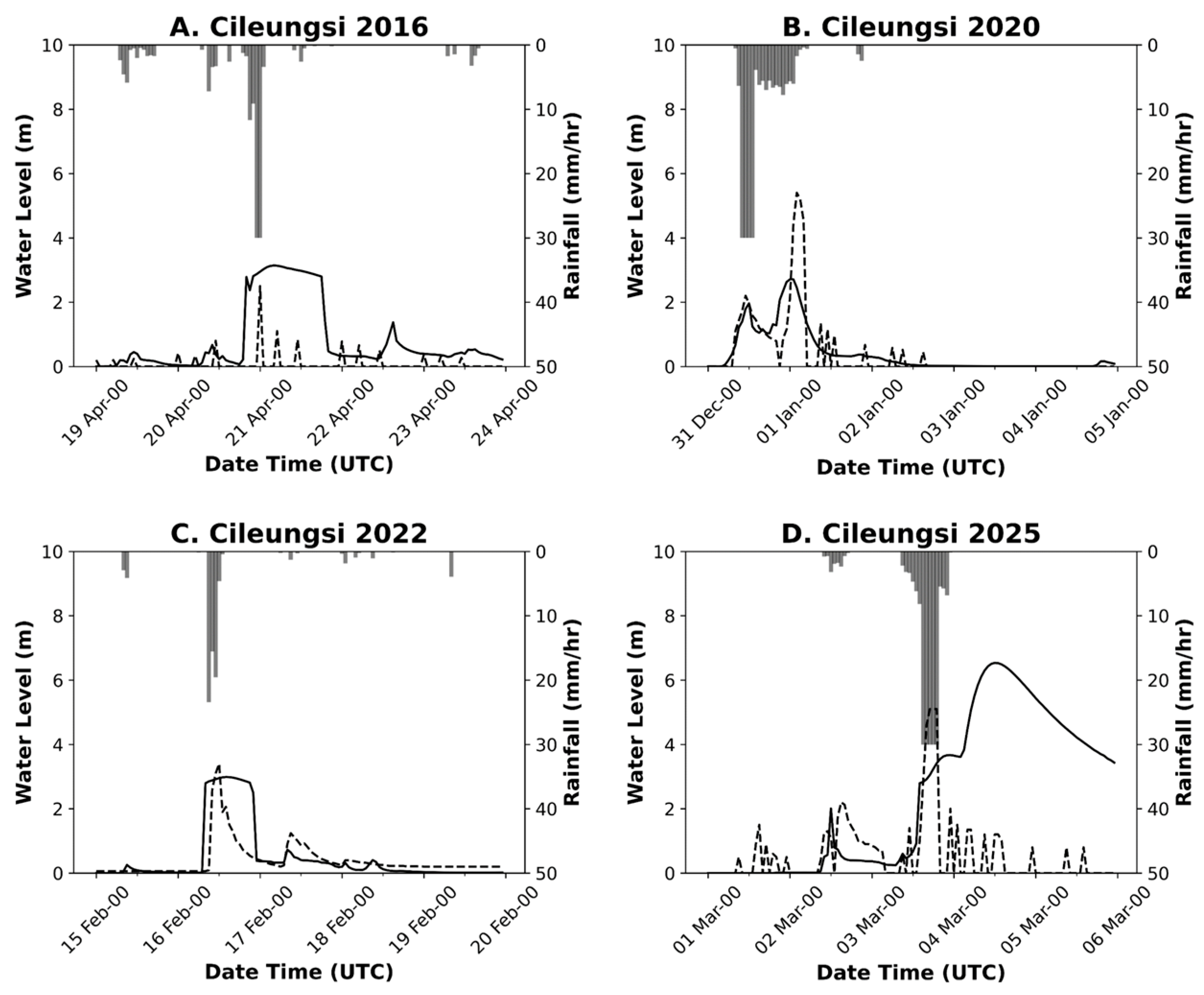 - Sulistyowati, R.; Hapsari, R.I.; Syamsudin, F.; Mori, S.; Oishi, S.T.; Yamanaka, M.D. Rainfall-Driven Diurnal Variations of Water Level in the Ciliwung River, West Jawa, Indonesia. SOLA 2014, 10, 141–144. [Google Scholar] [CrossRef]