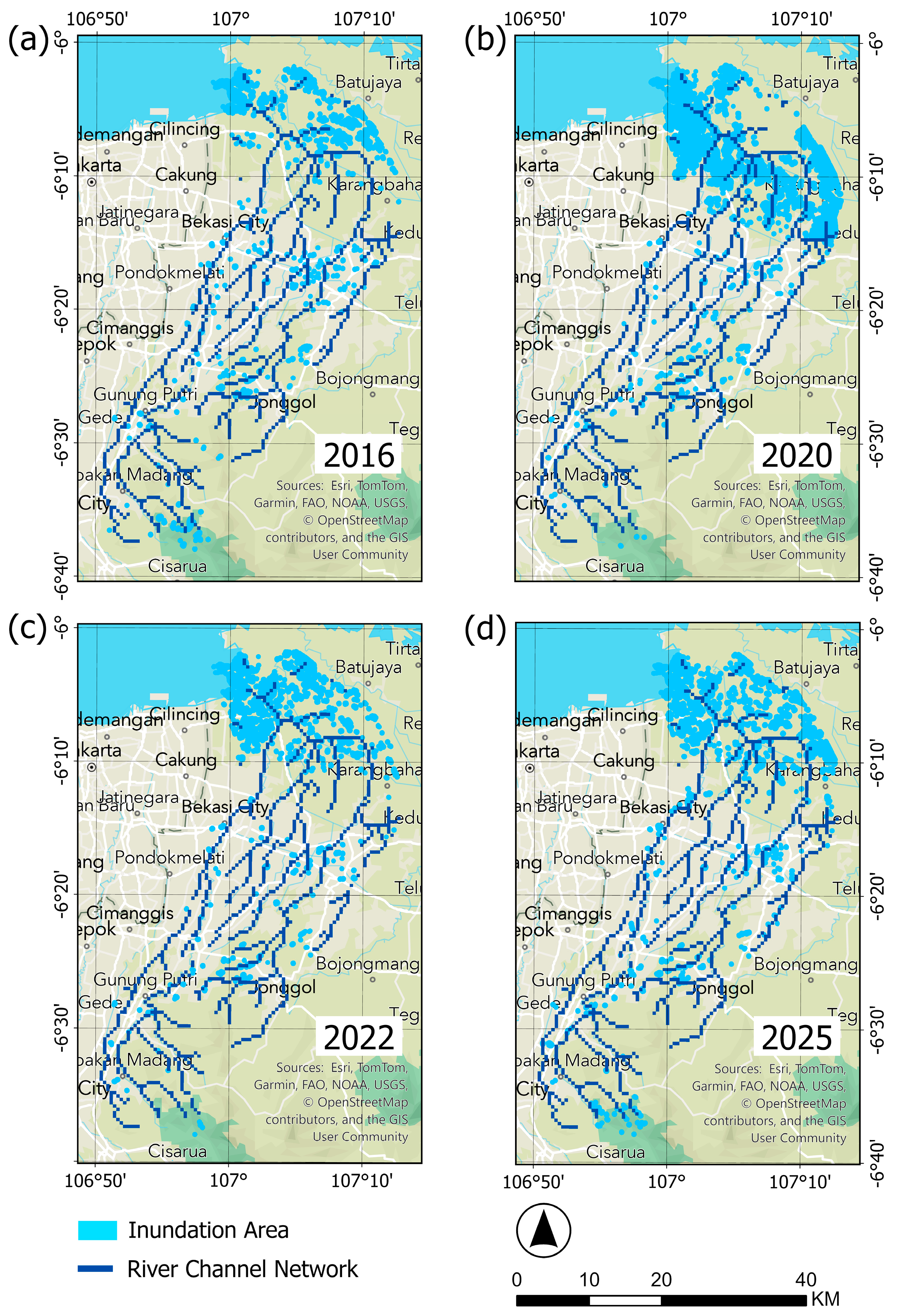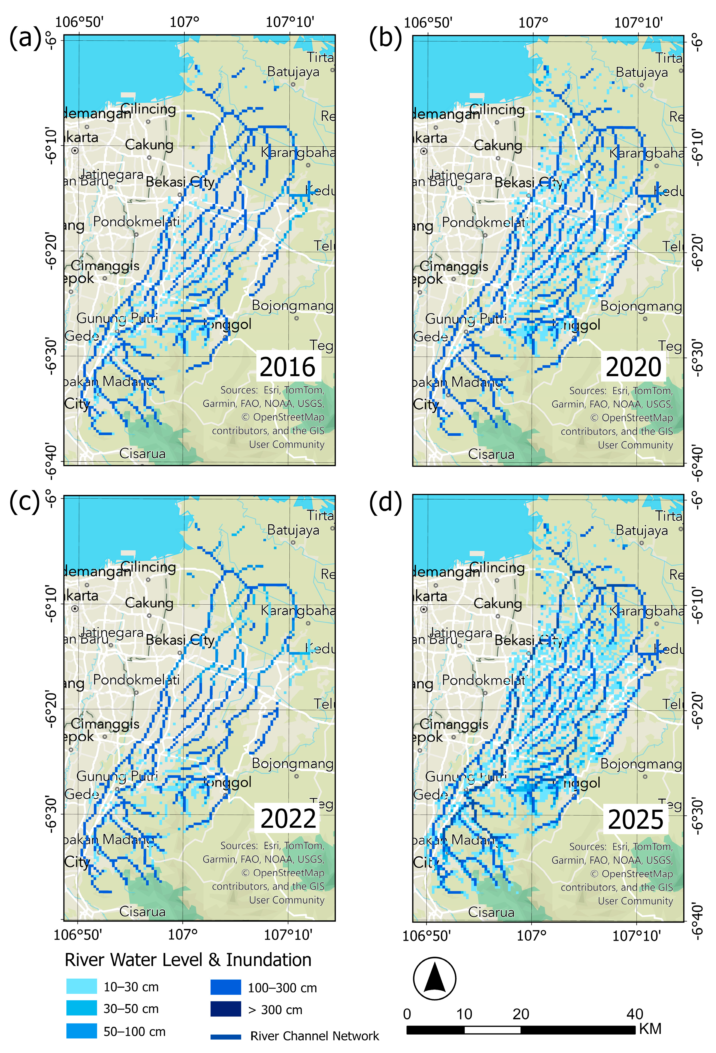 | 2022 | Jatiasih, Pondok Gede, East Bekasi, North Bekasi, South Bekasi, Medan Satria, Rawa Lumbu, Babelan, Tambun Utara, Gunung Putri, Muara Gembong | https://www.liputan6.com/news/read/4890876/bpbd-bekasi-ada-13-titik-banjir-4958-jiwa-terdampak (accessed on 14 April 2025) https://www.sonora.id/read/423147484/banjir-pertama-di-tahun-2022-kali-bekasi-meluap-sebabkan-8-kelurahan-tergenang-banjir-ada-yang-mencapai-2-m (accessed on 14 April 2025) |