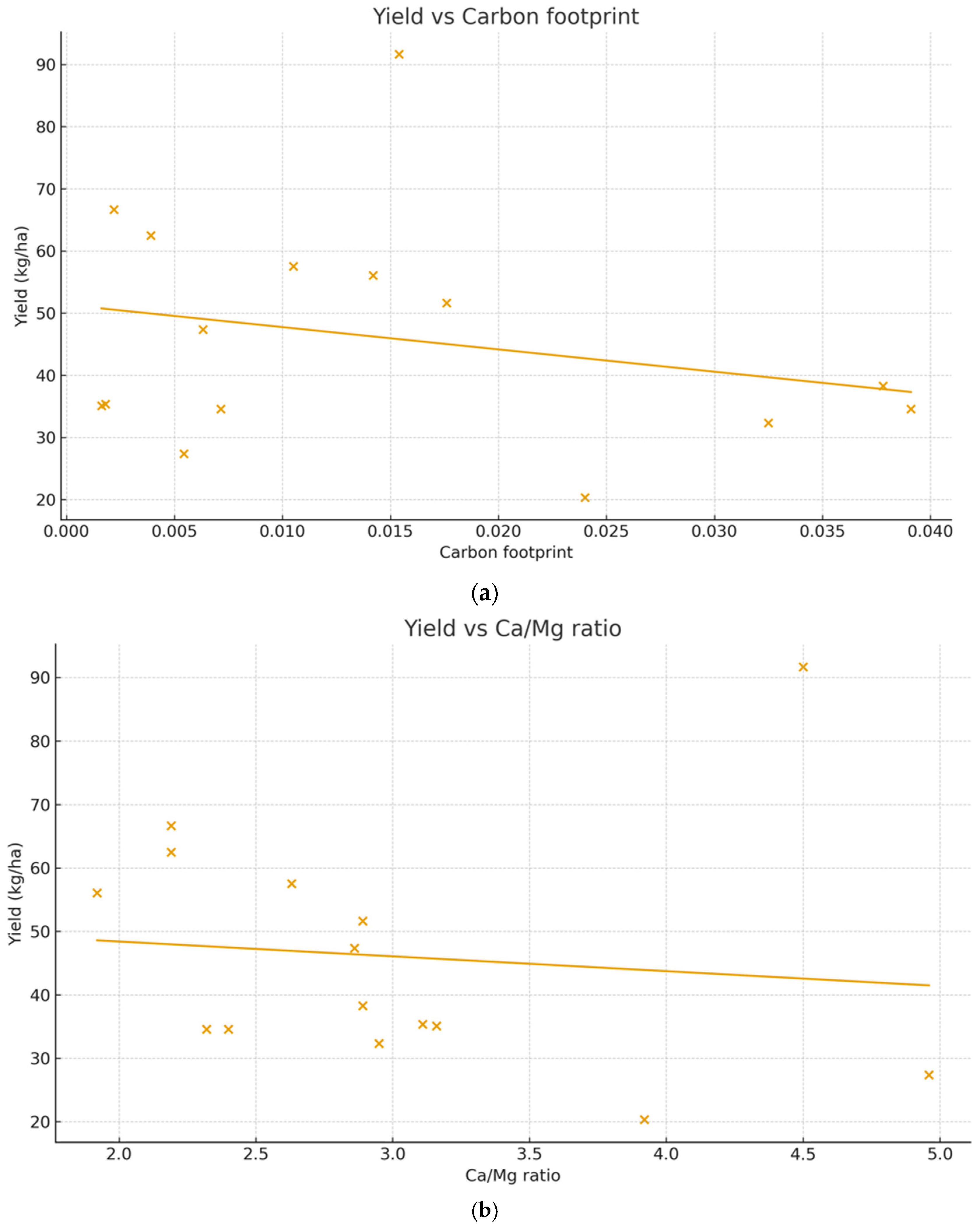 - Yield = −2.337 × (Ca/Mg ratio) + 53.077 (R2 = 0.012; p = 0.699; n = 15).