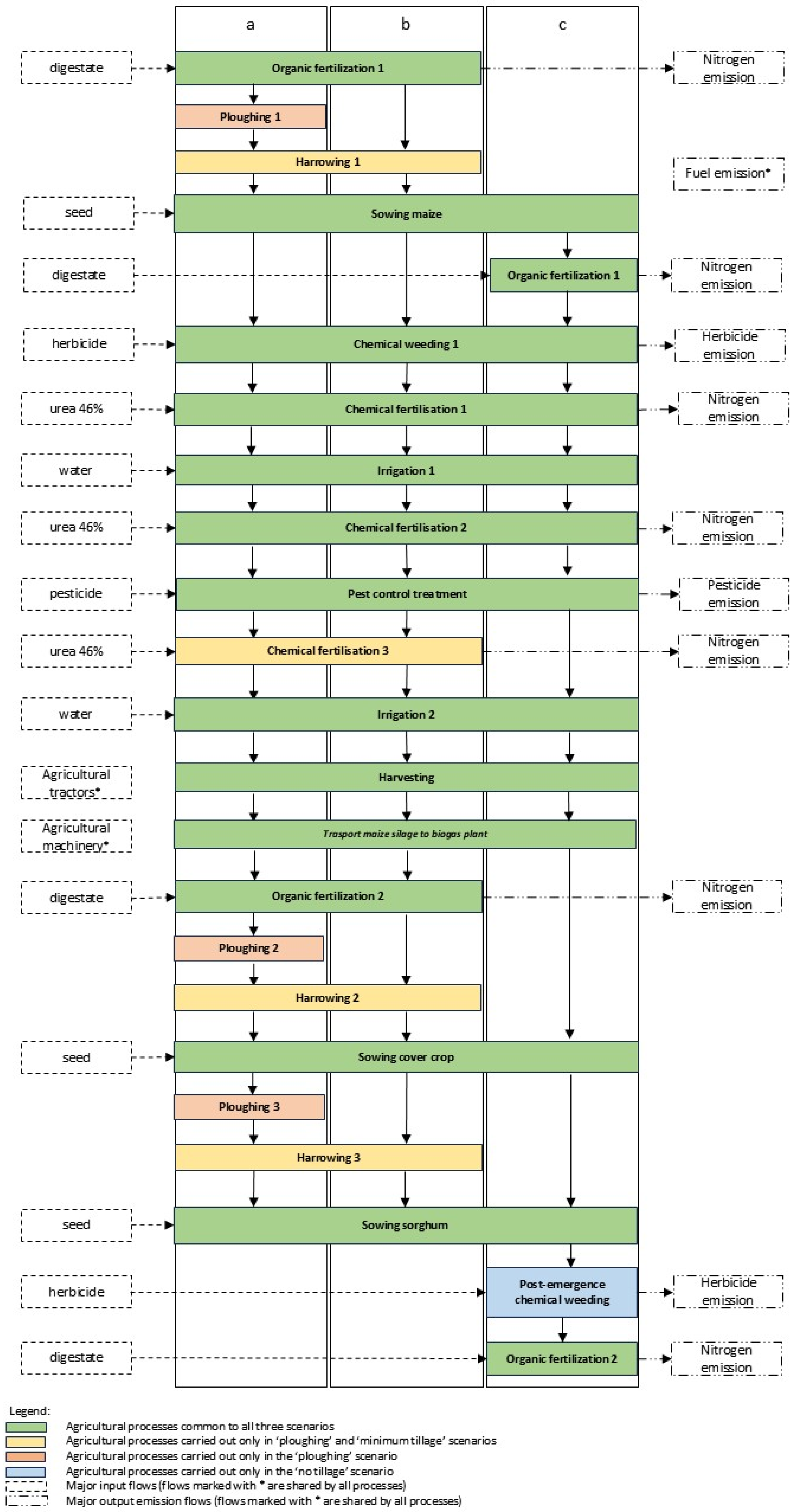 The functional unit (FU) selected for the study is one hectare of agricultural land cultivated with maize as an energy crop, in rotation with sorghum. This choice is relatively unusual in LCA studies in agriculture, where impacts are usually referred to the mass of the product as the functional unit (FU). We made this choice to optimise the focus of the results in line with the primary objective of the study, which was to compare the environmental impacts associated with different soil management techniques. All input and output flows relating to the analysed processes, including agricultural equipment and vehicles, fuel, fertilisers, pesticides and herbicides, as well as all emissions, are normalised to the FU.