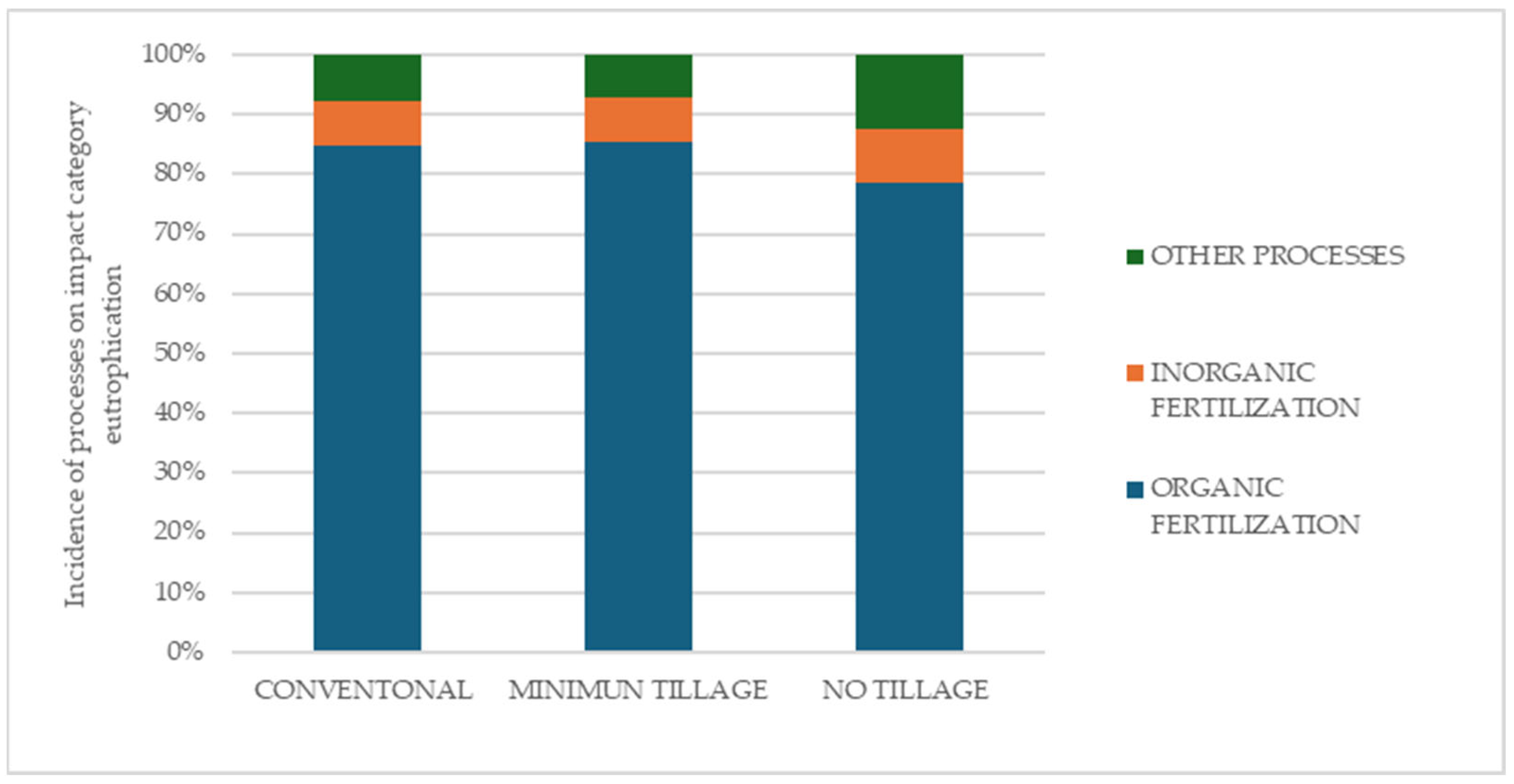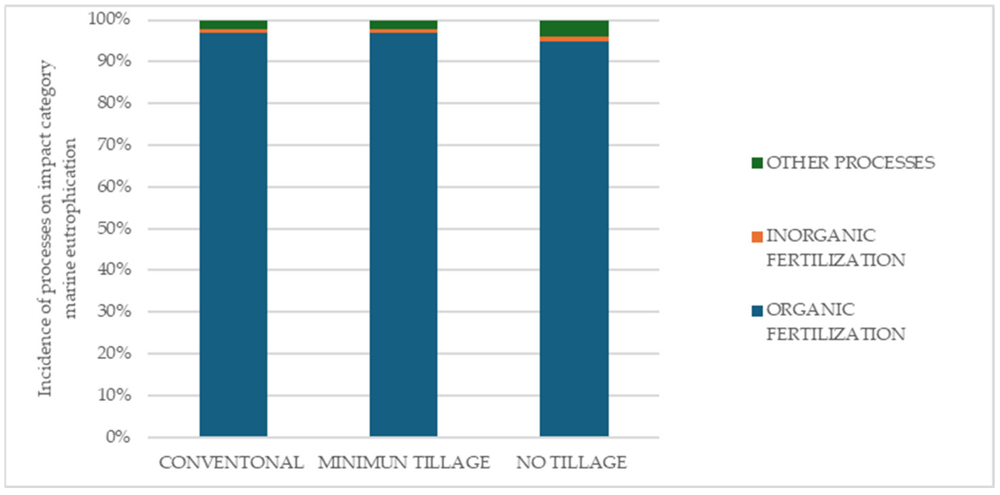 Figure 6. Contribution tree of the Marine Eutrophication impact category: percentage incidence of organic fertilisation (blue bars), inorganic fertilisation (orange bars) and cumulative effect of other processes (green bars).