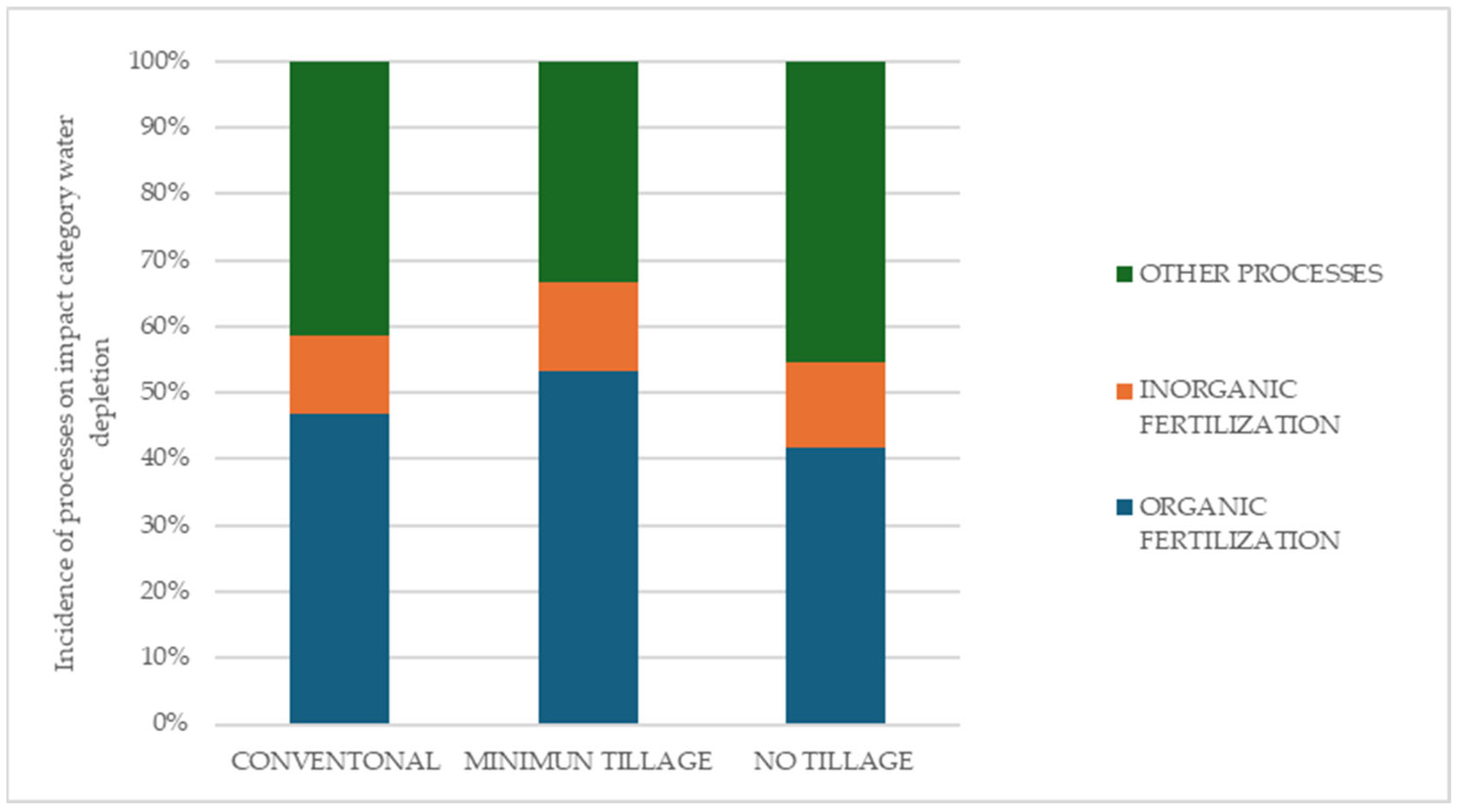 Figure 8. Contribution tree of the Water Depletion impact category: percentage incidence of organic fertilisation (blue bars), inorganic fertilisation (orange bars) and cumulative effect of other processes (green bars).