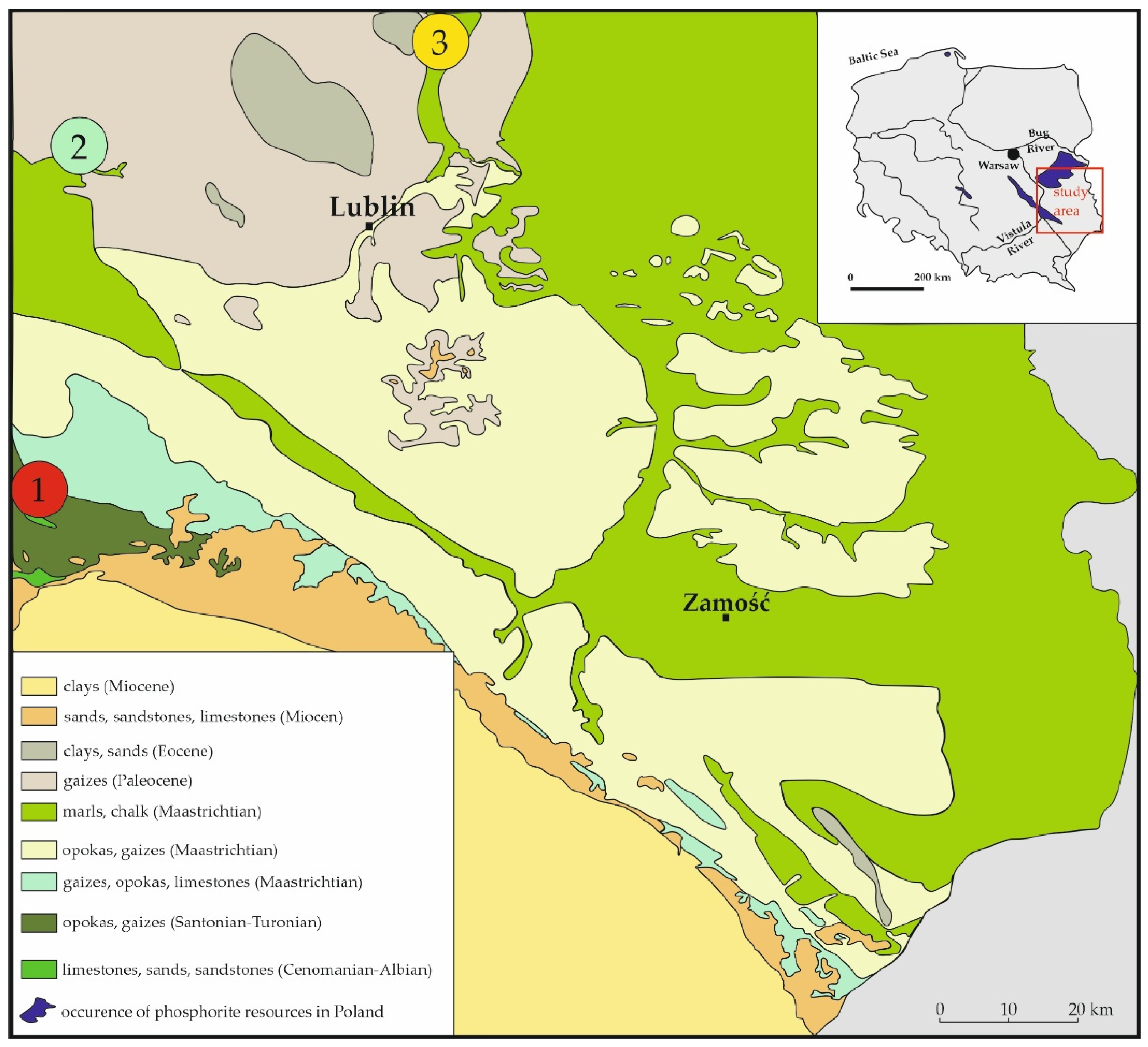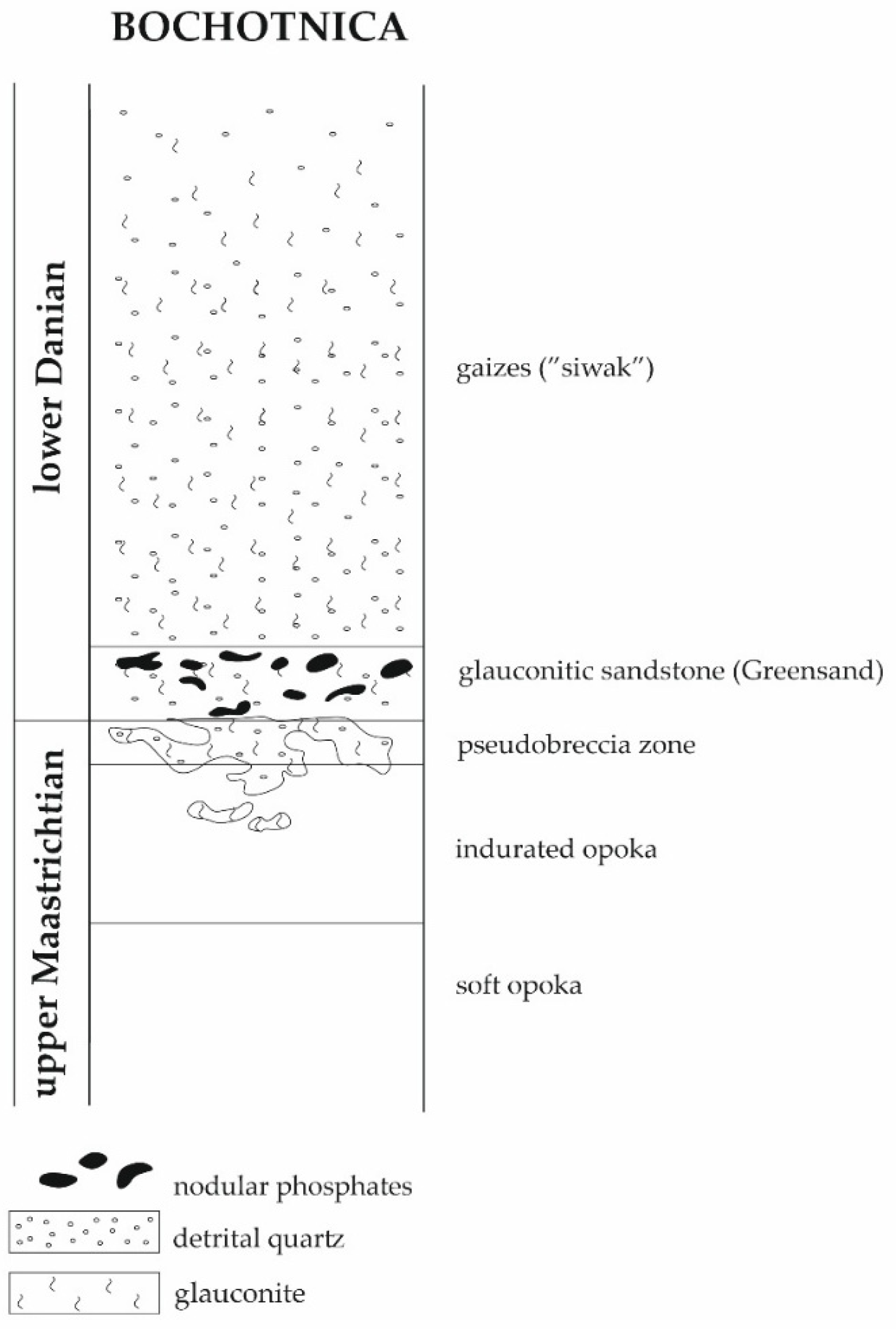 - Bochotnica—phosphate nodules associated with Danian glauconite sandstones;