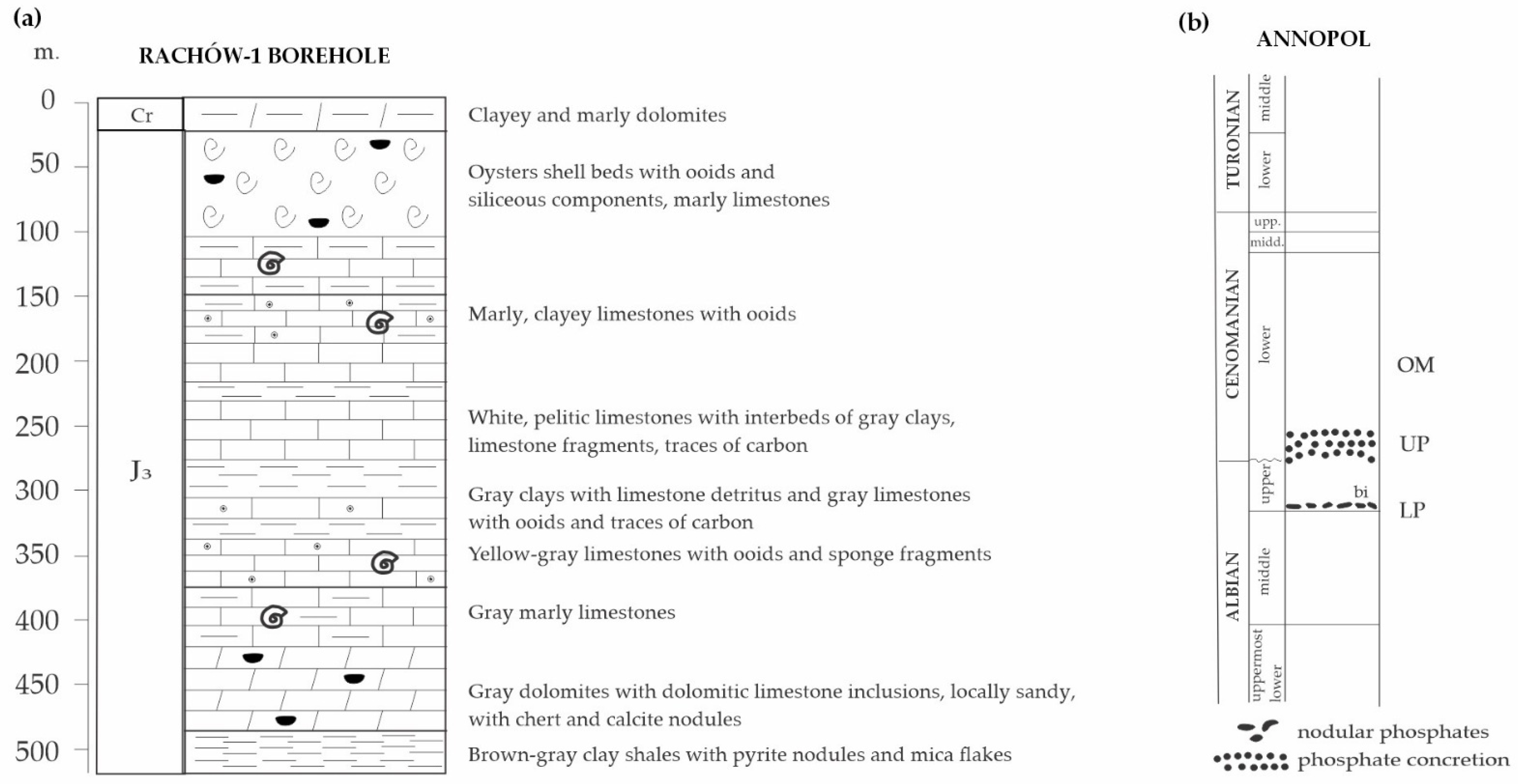 - Machalski, M.; Olszewska-Nejbert, D.; Wilmsen, M. Stratigraphy of the Albian-Cenomanian (Cretaceous) phosphorite interval in central Poland: A reappraisal. Acta Geol. Pol. 2023, 73, 1–31. [Google Scholar] [CrossRef]