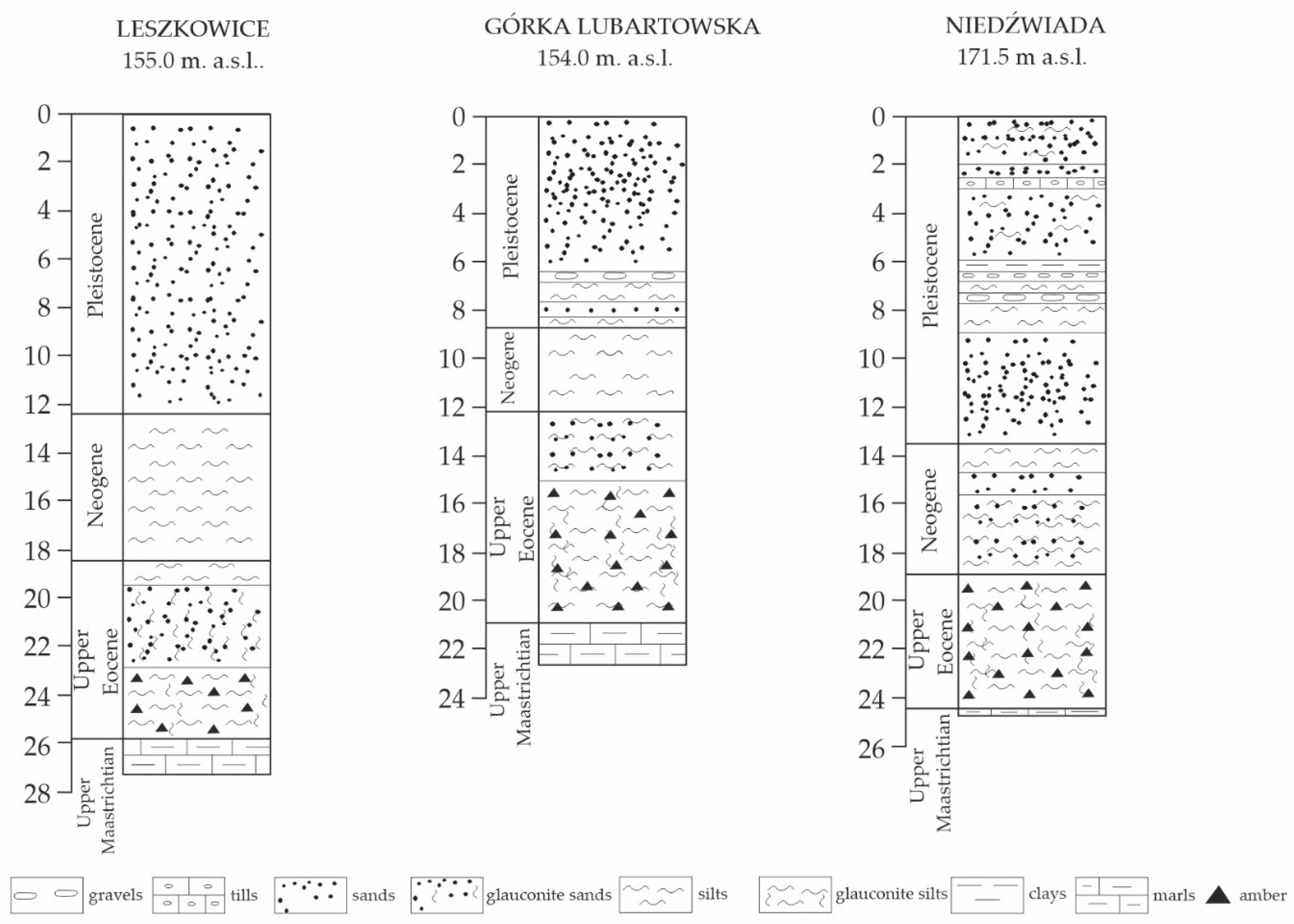 - Słodkowska, B.; Kasiński, J.R.; Żarski, M. Stratigraphic and environmental conditions of the occurrence of amber-bearing deposits in the northern Lublin region (Uwarunkowania stratygraficzno-środowiskowe występowania nagromadzeń złożowych bursztynu na północnej Lubelszczyźnie). Przegląd Geol. 2022, 70, 50–60, (In Polish with English Abstract). [Google Scholar] [CrossRef]