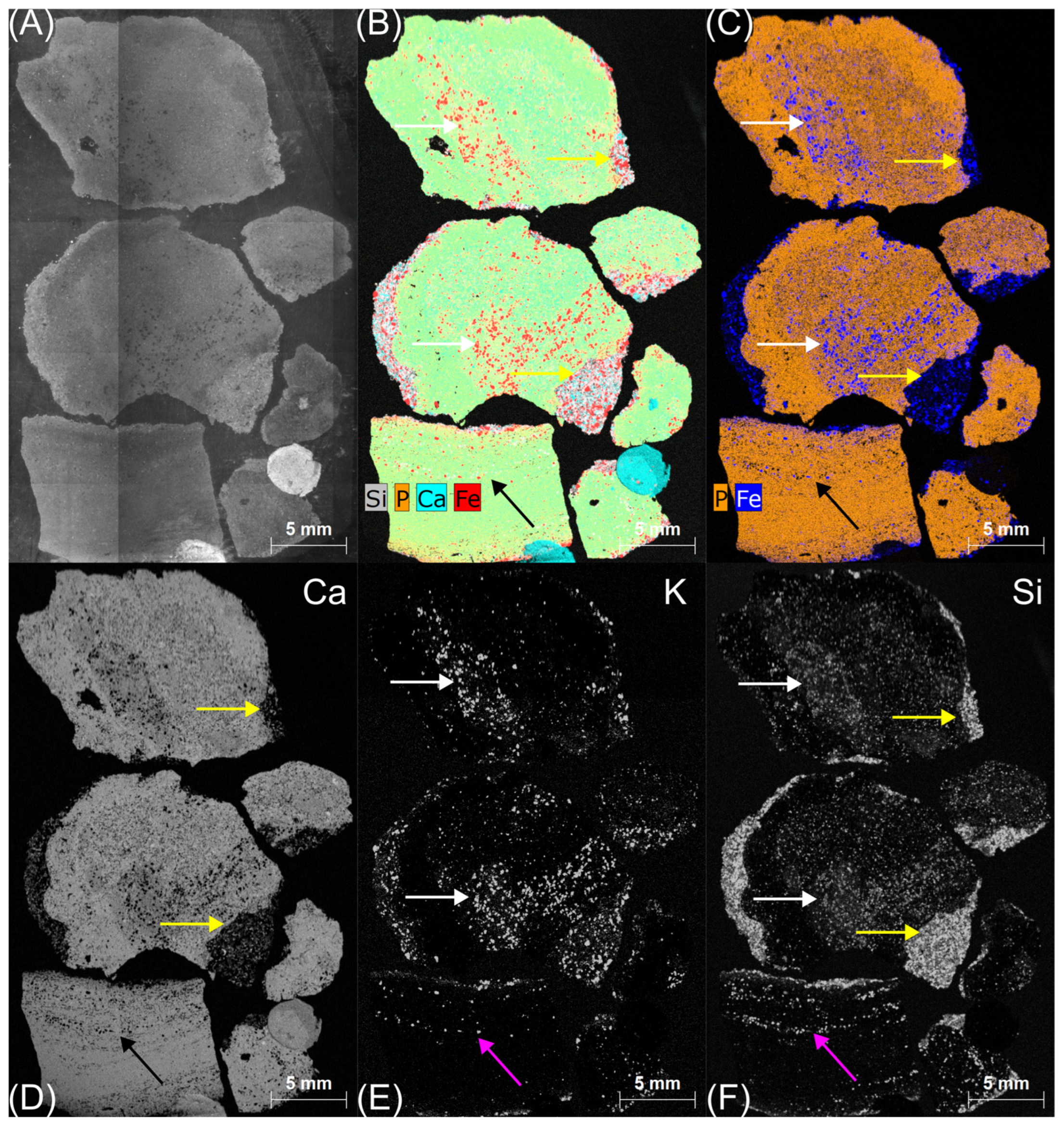 - Yoder, C.H.; Stepien, K.R.; Dudrick, R.N. The distribution of carbonate in apatite: The environment model. Am. Mineral. 2023, 108, 1072–1079. [Google Scholar] [CrossRef]