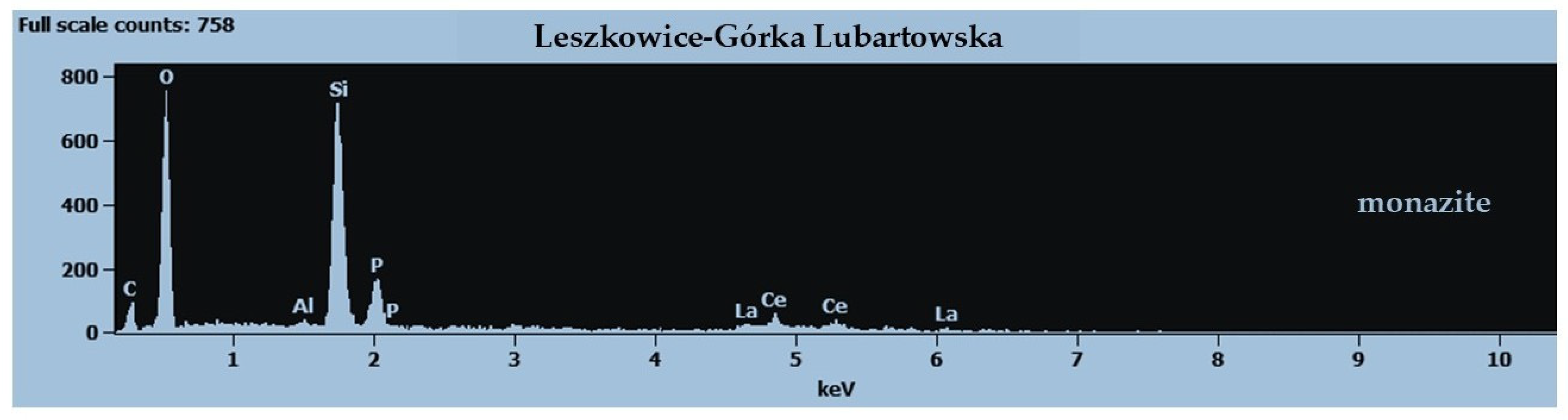 - Machowiak, K.; Huber, M.; Jastrzębski, M.; Stawikowski, W. Phosphates from Annopol (East Poland)—Preliminary results of rare earth elements analysis. Mineral. Spec. Pap. 2015, 44, 67–69. [Google Scholar]