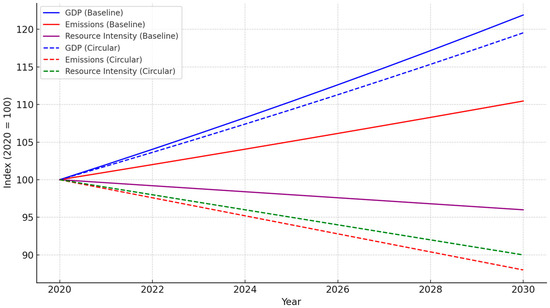 Projected indices of GDP, CO2 emissions, and resource intensity (2020 = 100) under two scenarios: business-as-usual (blue solid) and circular economy transition (green dashed). The circular economy scenario yields substantially lower emissions and faster gains in material efficiency, while maintaining GDP growth.