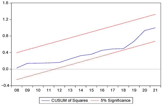 Similarly, the CUSUM-SQ test extends this analysis by considering squared recursive residuals, providing additional confirmation of model stability. If the CUSUM-SQ statistics remain within the critical bounds, we conclude that there are no structural breaks in the estimated relationships.
