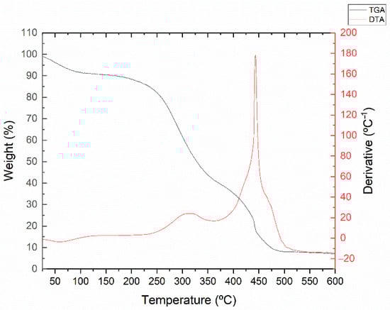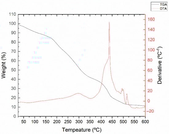 TGA/DTA curves of coffee husk. Heating rate 10 °C min−1, in an oxidizing atmosphere with a flow rate of 50 cm3 min−1.