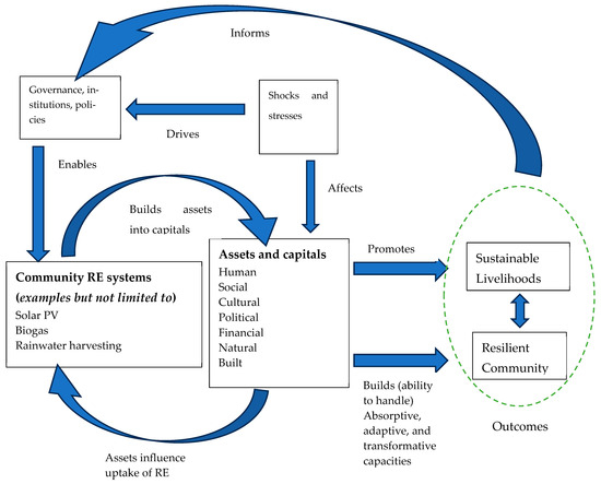 Community energy systems (CESs) are one of the means of addressing the accessibility issue, as well as of building resilience in local communities. These energy systems, along with other initiatives, such as health centers, schools, and agricultural cooperatives, promote the self-sufficiency of communities, facilitate the conservation of cultural legacy, and improve the overall standard of living [4]. It is imperative to define common terminologies related to community energy and resilience. The authors of ref. [5] define community as “a group of people who share a common physical environment, resources, and services, as well as risks and threats”. Community can also be defined in different contexts: community of place (geographical boundary), community of interest (people who share common interests), community of identity (a group of people with a shared sense of identity), and community of practice (a group of people who share a craft or profession) [6]. While community energy systems are defined as small-scale localized systems which produce heat and/or electricity that may be managed by or for the local people, they may be able to directly benefit these communities in other ways [7]. Furthermore, there are numerous environmental, economic, and social benefits of community-based heat and electricity generation [8]. Recently, the concept of community definition regarding energy systems was clarified by [9], a paper which shares 183 definitions found in the literature. Based on these different definitions, this paper defines community energy systems as “renewable energy technologies that are used by or shared by the group of individuals at a particular location which impacts their economic, environmental, social, political and infrastructural dimensions”.