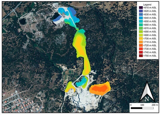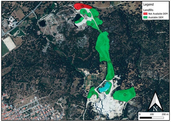 The volume calculation process was performed using QGIS (version 3.36.2-URL: https://download.qgis.org/downloads/ (accessed on 3 May 2024)). The project was set up with the EPSG:25832 coordinate reference system. A digital elevation model (DEM) provided by the Autonomous Region of Sardinia was then imported and downloaded from the appropriate portal []; specifically, a digital surface model (DSM) with a 1-metre resolution was used, derived from aerial LiDAR surveys conducted in 2013, with a vertical accuracy of ±15 cm and horizontal accuracy of ±30 cm. Using an orthophoto obtained from [] as a background, polygons were digitized to delineate each waste dump identified during the field survey (Figure 1). For each polygon representing the individual waste dumps, the corresponding portion of the DSM was then extracted using the “Clip raster by mask layer” tool (Figure 2).