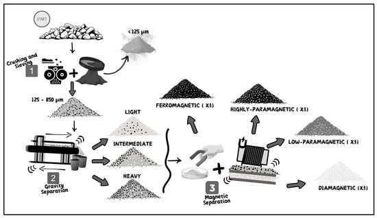 The sampling of granite EW was conducted within the quarry area to collect material from various landfill sites. Initially, the material from each sampling point was reduced in size using a pneumatic percussion hammer. By the end of the sampling campaign, 18 samples weighing between 3 and 7 kg each had been obtained. Each sample was then crushed using a jaw crusher. A portion of the crushed material was taken by quartering for whole-rock (WR) compositional analysis. The remaining material was sieved to isolate particles in a size range of 850 μm to 125 μm. Particles smaller than 125 μm, classified as crushing powder (CP), were not subjected to separation processes. Instead, this fraction was sampled by quartering for compositional analysis. Subsequently, the samples underwent gravity and magnetic separation processes, as previously performed in the study by Vaccaro et al. [] (Figure 3). These processes yielded various fractions, including diamagnetic, highly paramagnetic, weakly paramagnetic, and ferromagnetic materials. The present study focuses on the ferromagnetic and paramagnetic fractions obtained through these methods, aiming to evaluate the levels of CRMs enrichment achieved. Specifically, the fractions under investigation were as follows: