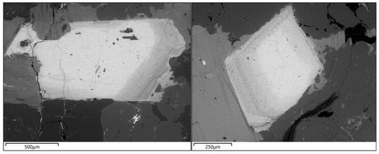 Backscattered electron (BSE) scanning electron microscope (SEM) photomicrographs. Examples of allanite crystals identified by SEM investigations on thin sections of granite EW.
