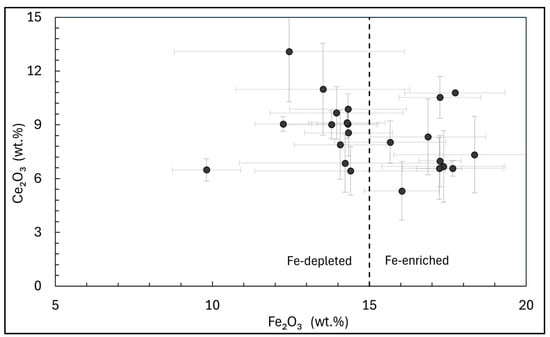 Scatter plot showing the average Fe2O3 and Ce2O3 content, calculated from semi-quantitative SEM-EDS analyses on allanite grains identified in thin sections of granite waste. Grey bars indicate the standard deviation (SD). The dashed line separates the fields of Fe-depleted allanites from Fe-enriched ones.