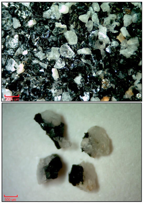 Considering the nature of the source material, the ferromagnetic mineral constituting these fractions is expected to be magnetite [], which is responsible for the bulk magnetic susceptibility of granites [], for instance. Based on this, it would be reasonable to expect Fe2O3 and SiO2 concentrations much closer to those typical of magnetite, with Fe2O3 exceeding 90 wt.% and SiO2 being lower than 0.1 wt.% []. The analytical results, however, reveal compositions that significantly diverge from those of pure magnetite, particularly in the HF fraction, where a higher if not exclusive accumulation is expected given the high density of this mineral (5.18 g/cm3) []. The explanation for this deviation from the expected results is confirmed by microscopic observations of the material. As shown in Figure 6, heterogeneity in color among the granules within the LF fraction is clearly visible. Many of the granules appear polymineralic, consisting of aggregates of magnetite and quartz or feldspars and, possibly, magnetite and biotite aggregates, which are more difficult to identify. From these observations, it appears that even the minimal presence of magnetite within the polymineralic grains imparts ferromagnetic properties to the grain. In light of this, it can be inferred that the combination of gravity separation and magnetic separation produces fractions in which the HF is relatively the purest, containing a higher abundance of magnetite within the polymineralic granules, with this abundance decreasing toward the IF and the LF fractions. These findings indicates that the crushing process and the particle size range extending up to 850 µm are not effective in fully liberating the magnetite minerals. To improve this aspect, it would be necessary to reduce the maximum particle size below 850 µm.
