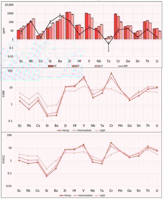 Top: comparison of trace element abundances in heavy ferromagnetic (HF), intermediate ferromagnetic (IF), light ferromagnetic (LF), and whole rock (WR), U concentration in WR according to Vaccaro et al. []. Middle: mean WR-normalized trace element patterns in ferromagnetic fractions. Bottom: mean upper continental crust (UCC)-normalized trace element patterns in ferromagnetic fractions.
