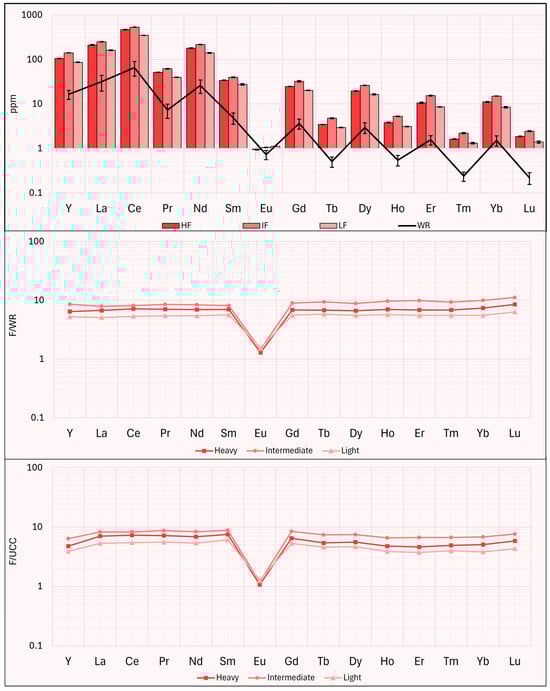 Top: comparison of REEs abundances in HF, IF, LF, and WR as REEs concentrations in WR (excluding Y) from Vaccaro et al. []. Middle: mean WR-normalized REEs patterns in ferromagnetic fractions. Bottom: mean UCC-normalized REEs patterns in ferromagnetic fractions.