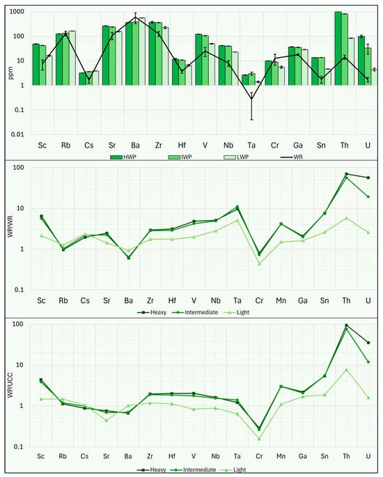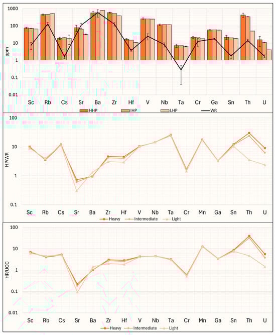 Top: comparison of trace element abundances in heavy highly paramagnetic (HHP), intermediate highly paramagnetic (IHP), light highly paramagnetic (LHP) fractions, and WR, U concentration in WR according to Vaccaro et al. []. Middle: mean WR-normalized trace element patterns in highly paramagnetic fractions. Bottom: mean UCC-normalized trace element patterns in highly paramagnetic fractions.