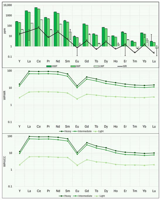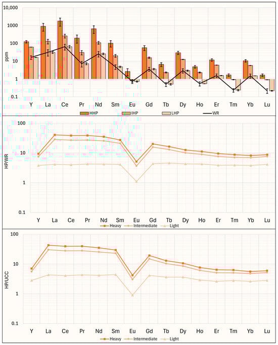 Top: comparison of REEs abundances in HHP, IHP, LHP, and WR and REEs concentrations in WR (excluding Y) from Vaccaro et al. []. Middle: mean WR-normalized REEs patterns in highly paramagnetic fractions. Bottom: mean UCC-normalized REE patterns in highly paramagnetic fractions.