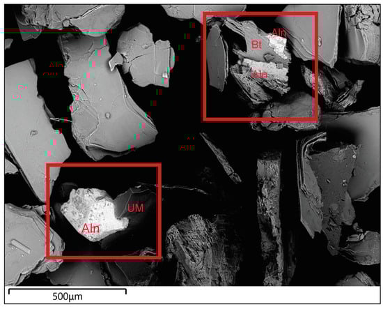 BSE SEM photomicrographs. Polymineralic grains of allanite and biotite or other minerals in the LHP fractions are highlighted in the red boxes. Aln: allanite; Bt: biotite; UM: unidentified mineral.