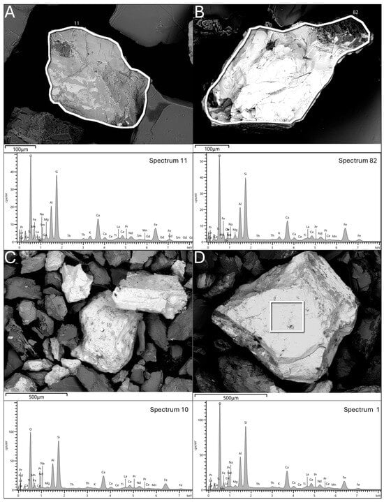 Comparing the obtained data with the literature data [,,,] reveals that the minerals identified within the granite EW are allanites and REEs silicate minerals within the epidote mineral group, with REEs content ranging from 14 wt.% to 33 wt.% and in which LREEs constitute more than 90% of the total []. These minerals are typically characterized by an REEs composition trend distributed as follows: Ce > La > Nd >> Pr > Sm > Gd []. The higher Ce content confirms that these minerals belong to the Ce–allanite variety [,,]. Furthermore, the presence of allanite as an accessory phase within the granites comprising the Buddusò pluton [,,], among which the granites extracted from the quarry under study are included, has also been highlighted in previous studies [].