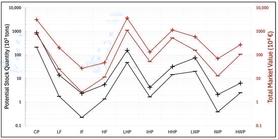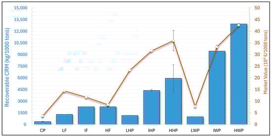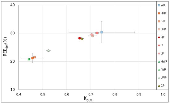 Subsequently, the above-described materials were analyzed to determine concentrations of trace elements. Specifically, two sets of elements were determined; the first set included Sc, Rb, Cs, Sr, Ba, Zr, Hf, V, Nb, Ta, Cr, Ga, Sn, Th, and U, while the second set included REEs. A total of 8 sub-samples were analyzed for the HHP category, along with two replicates for each mixed sub-sample from the other categories. Additionally, it was considered necessary to extend the characterization of Sc, Rb, Cs, Sr, Ba, Zr, Hf, V, Nb, Ta, Cr, Ga, Sn, and Y to both the WR samples and the CP samples, for which REEs determination had previously been conducted in the study by Vaccaro et al. []. This allowed for a comparison between the processed material and the original EW. These analyses were carried out by OMAC Laboratories Ltd. (IDA Business Park, Dublin Road, Loughrea, Ireland), accredited by the Irish National Accreditation Board under ISO/IEC 17025:2017 standards []. The procedure used was the ME-MS81™ method, in which samples were subjected to lithium metaborate fusion, followed by ICP-MS analysis.