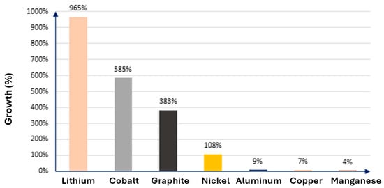 The above explains the growth in global lithium demand and the increase in its value since 2020, reaching the historic figure of USD 78,000 per ton of lithium carbonate. Although in 2024 its value significantly declined (USD 12,000 per ton of lithium carbonate), it is expected that its value will rise again in the coming years [7]. Critical metals needed for batteries’ fabrication, such as nickel, cobalt, and lithium, are projected to quadruple in value over the next two decades, reaching levels like fossil fuels (according to studies conducted by the International Monetary Fund) [7,11].