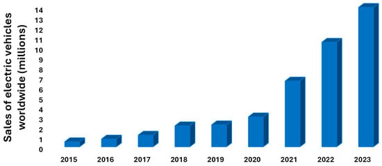 This has mainly been due to the rapid growth of the battery market, where in 2010 this market demanded 23% of lithium usage, in 2017 46%, and by 2023 it encompassed over 80% of lithium usage, with electromobility being the area where a greater growth in demand is observed (see Figure 2). In 2015, 500,000 electric vehicles were sold worldwide; in 2017, 1 million; by 2021, 6.5 million; and by 2023, nearly 14 million were sold (see Figure 3) [8,9,10]. Currently, the International Energy Agency estimated that 2024 would close with figures indicating that one in every five new cars sold will be electric.
