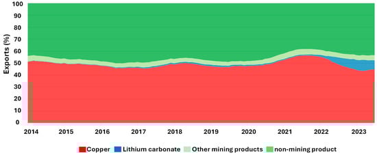 Figure 4 shows the export of products in Chile according to data from the Central Bank of Chile (the entity with official data on the economy in Chile), with the main focus being on products related to mining. As we know, Chile is the main exporter of copper worldwide, with copper representing a value close to 9% of its national GDP (Gross Domestic Product); as shown in Figure 4, copper exports represented 45.3% in 2022 [12].