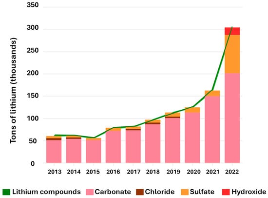- Gutiérrez, G.; Ruiz-León, D. Lithium in Chile: Present Status and Future Outlook. Mater. Adv. 2024, 5, 7850–7861. [Google Scholar] [CrossRef]