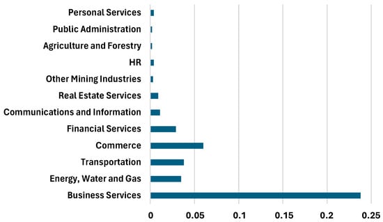 Based on the latest input–output matrix, the productive chains of mining that include lithium extraction are estimated (Figure 6). This means the capacity to drag production from other industries through its demand for intermediate goods. The results show that business services is the sector with the greatest chain derived from lithium production, mainly due to the demand for architectural and engineering services.