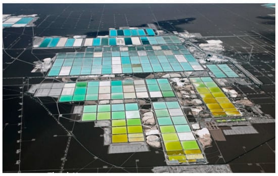 Currently in the country, both the SQM and Albemarle companies extract lithium from well brines through the solar evaporation process [13,14]. This involves transferring brine through a succession of ponds, where the lithium concentration increases from an initial 0.2% in the brine (light blue) to 6% (yellow) over 18 months, while other minerals like potassium, magnesium, boron, and others settle out (see Figure 7). This process is the most efficient and cost-effective worldwide and uses only the water present in the brines. It has often been claimed that lithium companies in Chile have high water consumption, which is not true (as it only considers the water within the brines) [15,16]. Furthermore, requiring a drastic change in this industry could risk losing this unique comparative advantage of our salt flats (the highest concentration of lithium in brines globally, with ~1800 ppm in the Salar de Atacama, accompanied by high solar radiation and a favorable magnesium-to-lithium ratio that currently makes us more competitive than other salt flats in neighboring countries) [7] (see Table 1).