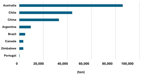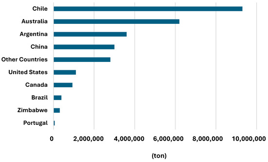 As can be seen in Figure 9, Chile, with 9.3 million tons of lithium, has the largest lithium reserves in the world through its continental lithium brine deposits, where Salar de Atacama stands out, with the most concentrated lithium brines on record. However, in lithium production, it is surpassed by Australia; in Australia, it is easier to invest in and process environmental permits (see Figure 10).