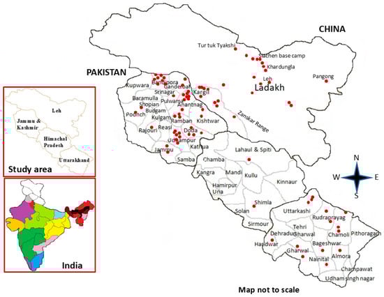 Eighty-one accessions of 40 Artemisia spp. were collected from different geographical locations from the Western Himalayan (WH) and Trans-Himalayan (TH)regions of India, covering an altitudinal range from 322 m to 5046 m above mean sea level (m asl) (Figure 1, Table 1). There was no requirement for the collection permit to collect studied Artemisia spp. accessions from their natural habitat. Most of the studied Artemisia spp. had global distribution except for A. amygdalina, A. austrohimalayaensis, A. banihalensis, A. dubia, and A. filiformilobulata which were endemic to the region. The study area comprises the two states of India, viz., Uttarakhand and Himachal Pradesh, as well as two Indian Union territories, Jammu and Kashmir and Ladakh. The study area covers a wide range of topography, from hot plains to hilly and mountainous valleys characterized by tropical to temperate and alpine environments. The collected Artemisia spp. accessions were identified by using regional floras, eFloras, research publications on the Artemisia spp. of the study area [3,4,26,27,28,29], online Kew Herbarium and Janaki Ammal Herbarium (RRLH) at the Council of Scientific and Industrial Research (CSIR-IIIM), Jammu, Union Territory of Jammu and Kashmir, India. Botanical names and synonyms were authenticated through Kew’s ’Plants of the World’ database (www.plantsoftheworldonline.org, accessed on 22 December 2022). Voucher specimens were prepared and deposited in the internationally recognized Janaki Ammal Herbarium (RRLH).