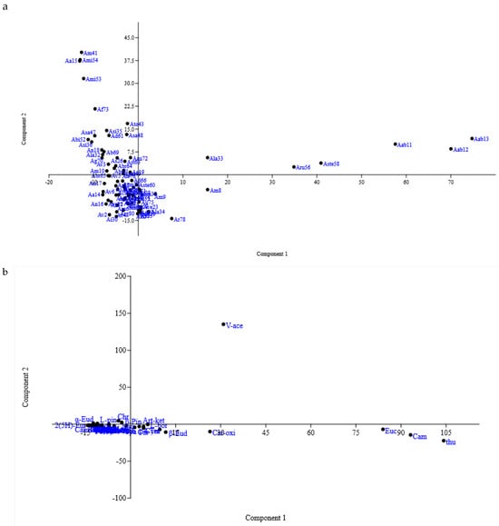 (a) PCA score plot for the main variation in essential oil composition among Artemisia spp. accessions. (b) Loading plot for essential oil components explaining 42.31% of the variation on PC1 and PC2 axes.