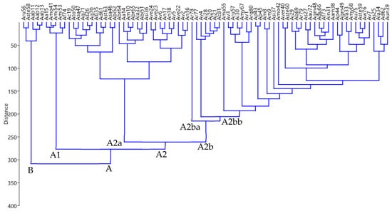 A dendrogram constructed from the statistical analysis of the identified compounds of each accession is shown in Figure 3. Essential oil composition showed notable differences among the studied Artemisia spp. accessions. The dendrogram of 81 accessions consisted of two major clusters named A and B. Accessions with relatively high amounts of verbenyl acetate were grouped in Cluster B. These accessions were Aru 56 (38.66%), Aste58 (44.49%), Aab11 (62.87%), Aab12 (74.87%) and Aab13 (80.67%). The results indicate that the accessions of A. absinthium (Aab11, Aab12, and Aab13) fall in the same clusters due to similar major compounds.