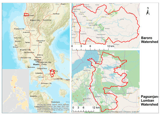 The location map of the Pagsanjan-Lumban Watershed in the Laguna Lake Basin and the Bororo Watershed in La Union province.
