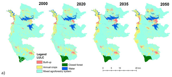 In the BW, annual crops, constituting a substantial 34.4% in 2000, gradually reduced to 32.5% in 2020. Predictions anticipate a decline to 31.1% in 2035, followed by a marginal increase to 31.9% in 2050. Built-up areas, which began at a modest 0.9% in 2000, have consistently increased, reaching 1.7% in 2020. Forecasts suggest a notable escalation to 3.2% in 2035 and a further rise to 4.1% in 2050. Closed forests, representing 4.3% in 2000, have significantly decreased to 1.6% in 2020, with predictions indicating a continued reduction to 1.5% in 2035 and stabilization at 0.8% in 2050. The predominant land cover, mixed agroforestry systems, covered 59.9% of the BW in 2000, then witnessed an increase to 63.8% in 2020. Projections suggest a slight decrease to 63.7% in 2035 and a more notable decline to 62.6% by 2050. Water bodies, constituting a minimal 0.4% in 2000, have experienced a decrease to 0.3% in 2020. Forecasts indicate a slight increase to 0.6% in 2035, followed by a subsequent decrease to 0.5% in 2050.