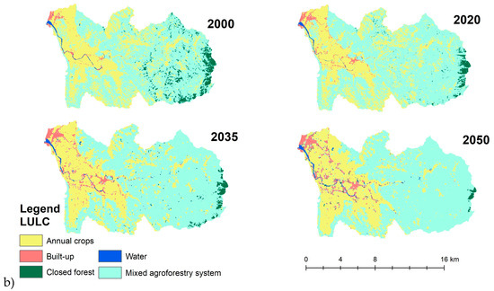 The historical and projected LULC trends are evident in the PLW and the BW (Table 3 and Figure 3). In the PLW, the coverage of annual crops decreased from 14.3% in 2000 to 12% in 2010, followed by a slight increase to 13% by 2020. Forecasts suggest a further rise to 13.2% in 2035, with a more substantial increase to 16.1% by 2050. Built-up areas expanded from 2% in 2000 to 3.1% in 2010, declining to 2.8% by 2020. Projections anticipate further increments to 3.3% in 2035 and 3.4% in 2050. Closed forests in the PLW expanded from 1.6% in 2000 to 2.8% in 2010, with a slight reduction to 2.7% by 2020. Forecasts indicate a continual rise to 2.8% in both 2035 and 2050. Mixed agroforestry systems, the predominant feature, comprised 77.7% in 2000, remaining relatively stable at 77.8% in 2010 and experiencing a slight decrease to 76.7% by 2020. Predictions suggest a further reduction to 76.1% in 2035, followed by a more pronounced decline to 72.8% by 2050. Water bodies, constituting 4.4% in 2000, exhibited a slight increase to 4.7% in 2020, with projections indicating a marginal decrease to 4.6% in 2035 and a subsequent rise to 4.9% by 2050.