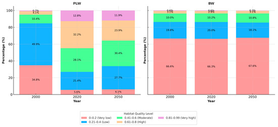 An overview of habitat quality levels within the PLW and the BW across various LULC categories for 2010, 2020, and 2050 (the color matches with Figure 5).