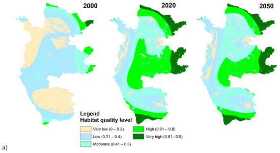 Conversely, the overall habitat quality in the BW has demonstrated relative stability, showing a very modest increase from the year 2000 baseline until 2020, with further improvements expected by 2050. However, the habitat quality is predominantly distributed among deficient levels (0–0.2) and low levels (0.21–0.4) (Figure 5b). Notably, there has been a marginal enhancement in the low habitat quality level, with a decrease from 66.6% in 2000 to 66.3% in 2020 and a slight increase to 67.6% by 2050. Concurrently, the extent of moderate habitat quality (0.41–0.6) has remained relatively consistent, while the very high habitat quality levels (0.61–0.8) have experienced a marginal decline from 2000 to 2020, with a subsequent stabilization at 3.1% by 2050.