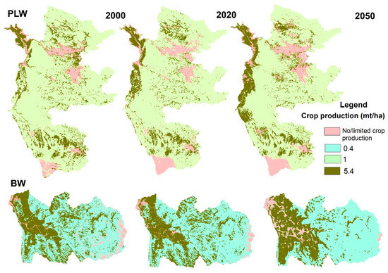 This calculation provided an estimate of the total food production for both watersheds, based on the distribution of agricultural land across the annual crop and mixed agroforestry system areas. Finally, the calculated production data were used to generate spatial maps that illustrated the distribution of food production within the BW and PLW, offering a visual representation of food production potential at the watershed scale. The estimation of food crop production in this study focuses explicitly on land areas designated for annual crops and mixed agroforestry systems. No food crop production has been assumed in built-up, closed forest, and water LULC. This assumption is consistent across all years analyzed (2000, 2020, and 2050).