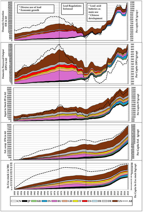 The historical progression of lead flows from 1950 to 2018 reveals distinct patterns in the sourcing, processing, and accumulation of lead. Over this period, the global lead cycle evolved through three major phases: (i) an era of diversified lead applications and economic expansion (1950–1976), (ii) a transition period marked by regulatory interventions and changing industrial demands (1977–1994), and (iii) a consolidation phase where lead–acid batteries dominated consumption patterns, and global production centers shifted (1995–2018). Each of these phases is characterized by shifts in domestic extraction, domestic processed output (DPO), input to stock, and end-of-life (EOL) scrap generation as presented in Figure 2 and Figure 3 below.