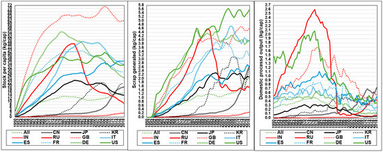 1950–2018 evolution of per capita stock, end-of-life scrap and domestic processed output. CN: China, JP: Japan, KR: South Korea, IN: India, RU: USSR until 1991 and Russian Federation after, GB: Great Britain, IT: Italy, ES: Spain, FR: France, DE: Germany, US: United States.