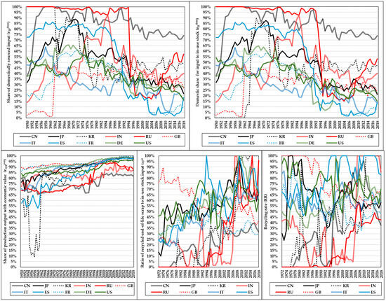 - Ratio of recycled end-of-life scrap to in-use stock input: Indicates the fraction of final demand that can be met by secondary materials.